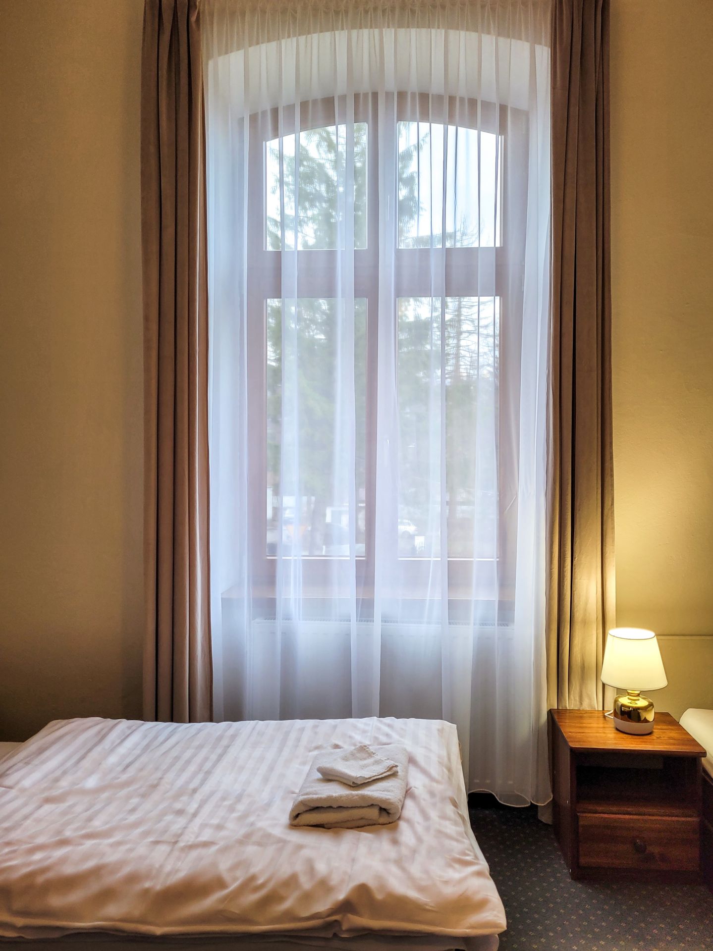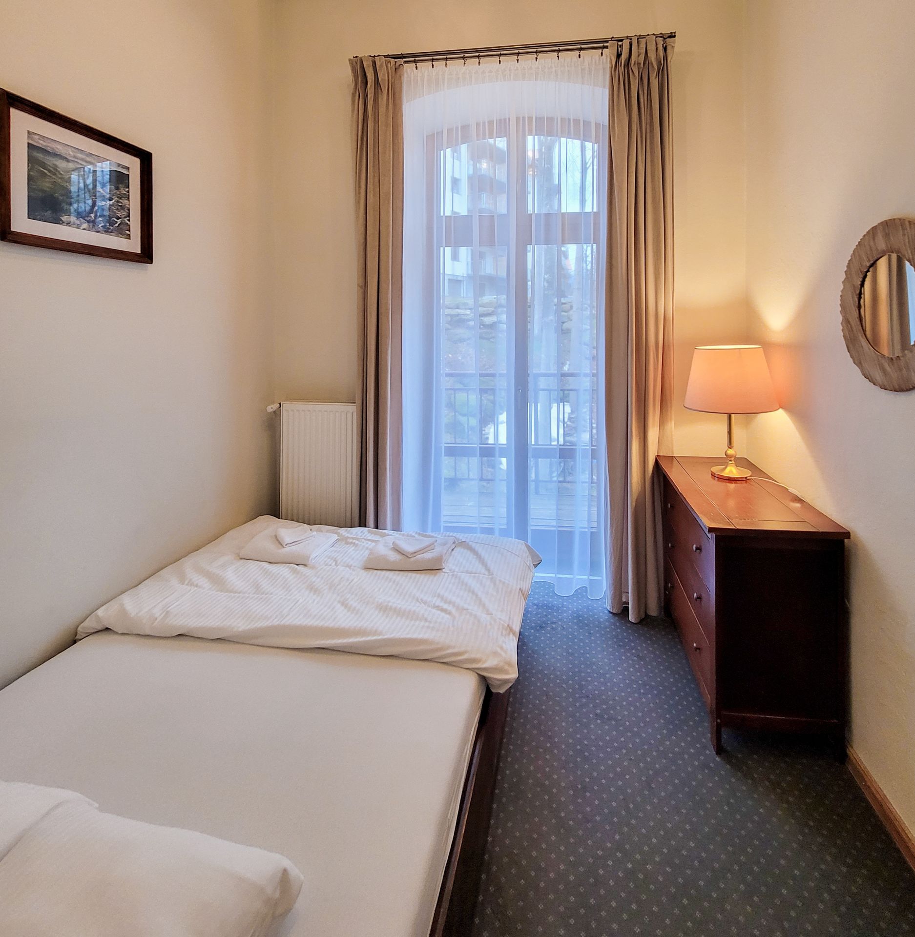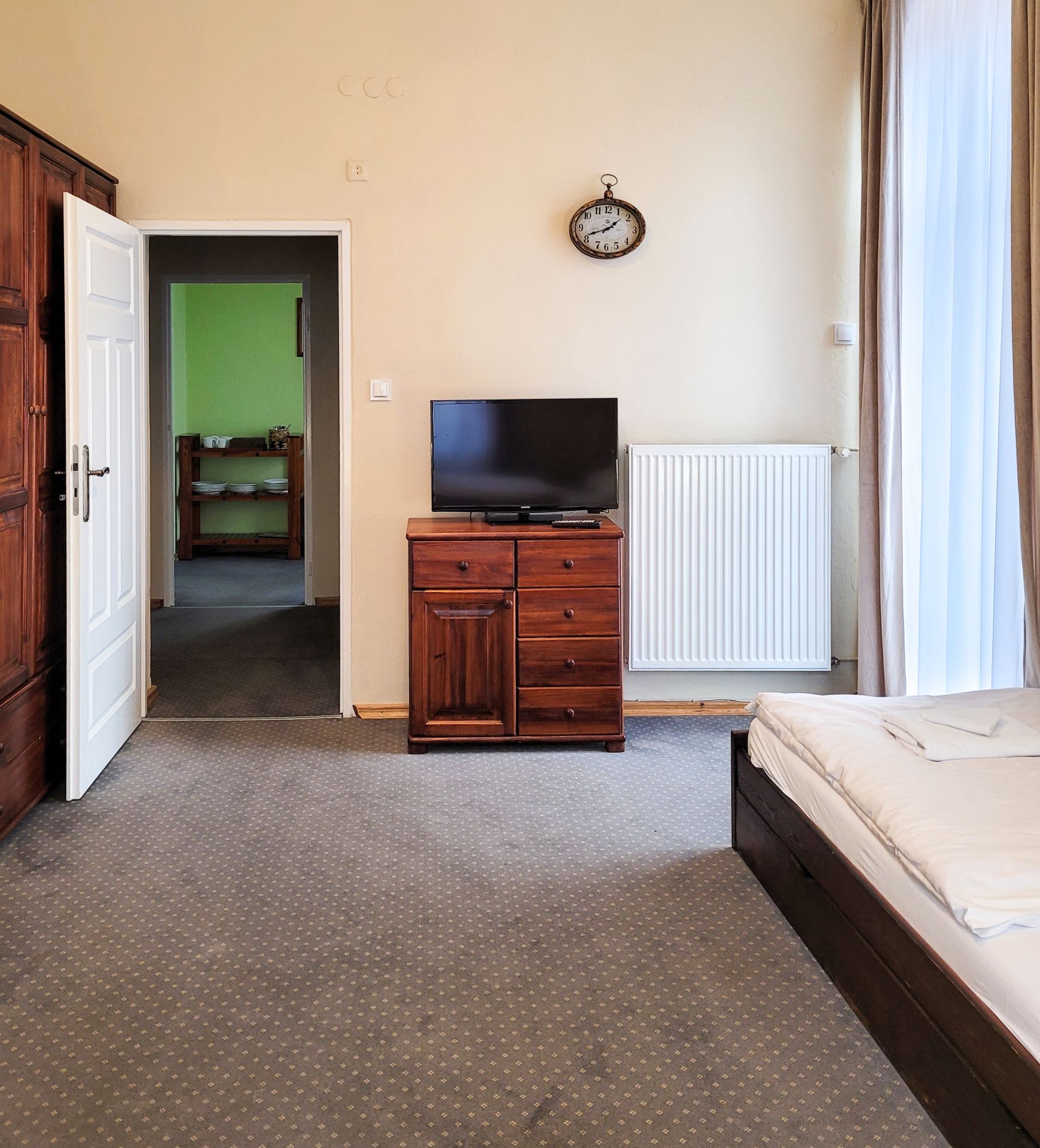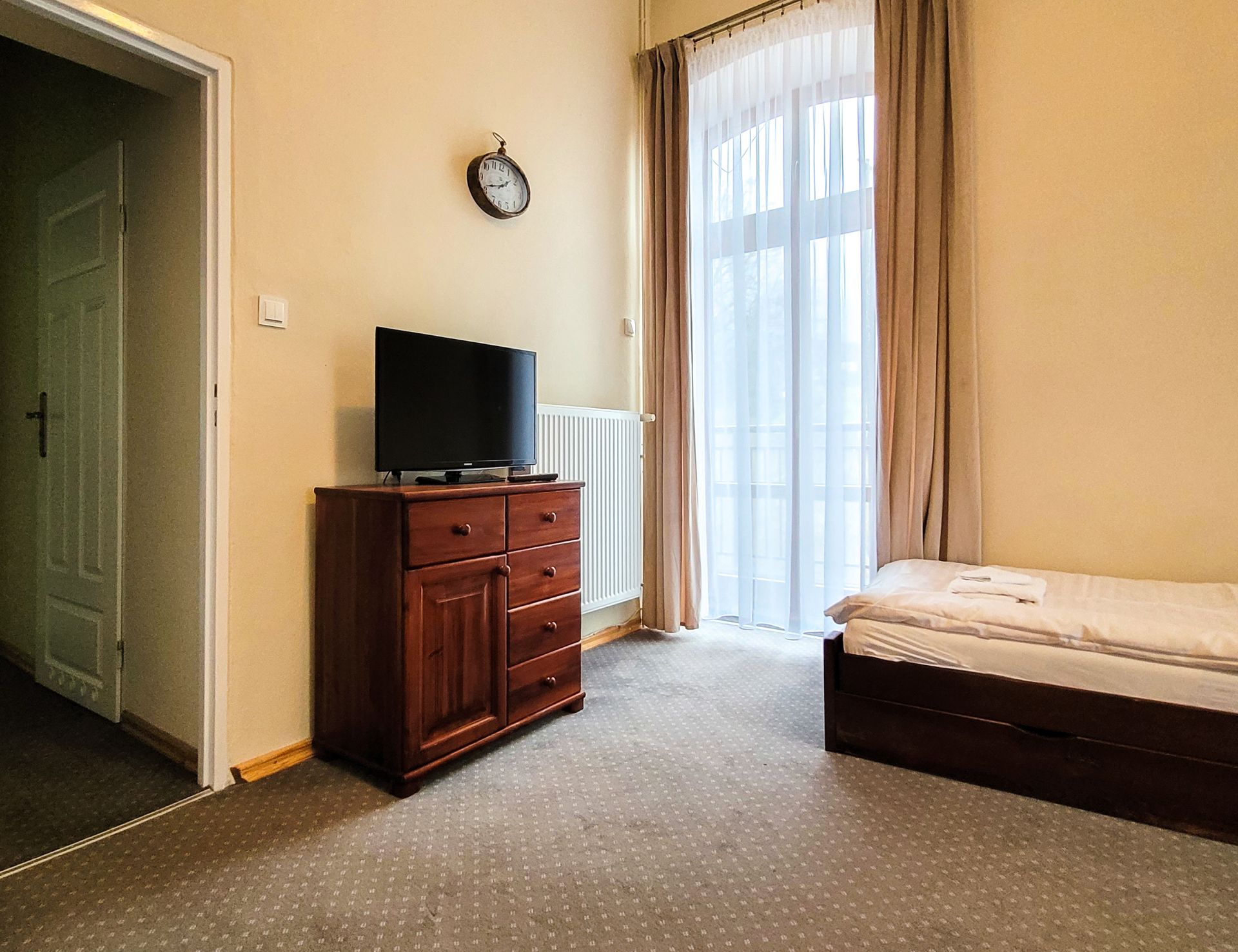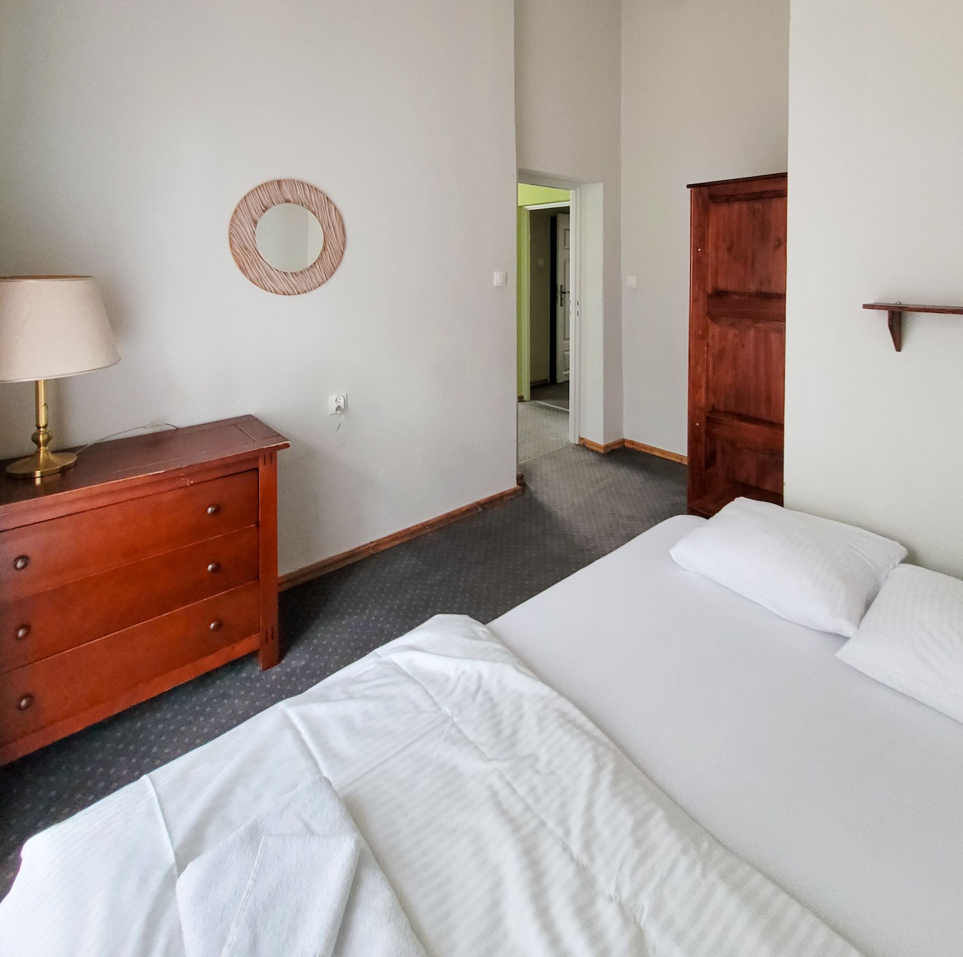 Przestronne studio wyposażono w jedno podwójne i trzy pojedyncze łóżko. W pokoju znajdują się także: lodówka, TV, czajnik bezprzewodowy, stoliki nocne, lampki do czytania, miękkie ręczniki hotelowe oraz szafa z półkami i wieszakami na ubrania. W pokoju znajduje się również stolik z krzesłami, zestaw do przygotowania kawy i herbaty. Do dyspozycji naszych Gości jest również ogólnodostępny w pełni wyposażony aneks kuchenny. Wszyscy Goście mogą bezpłatnie korzystać z dostępu do Internetu (WIFI).