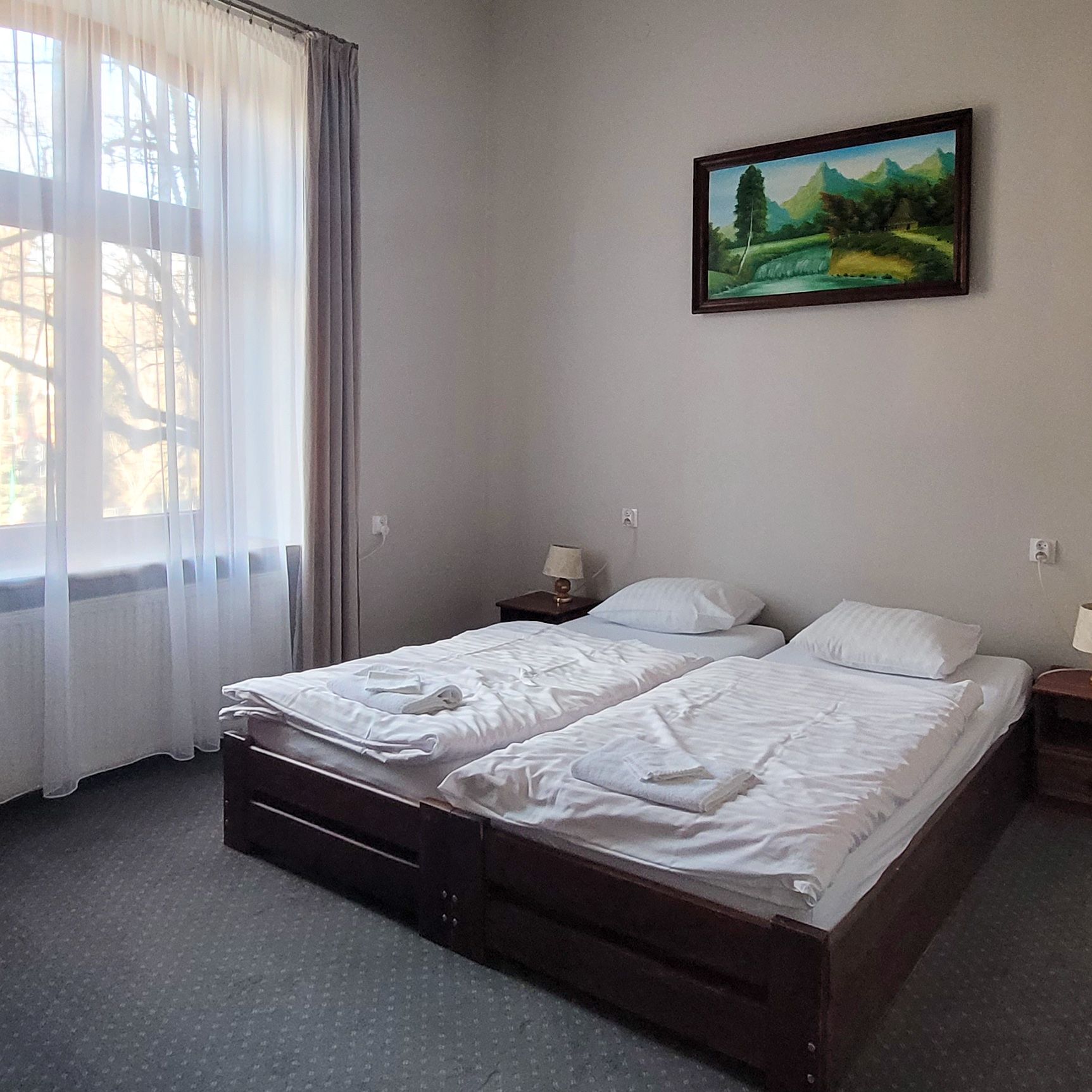 Przestronny pokój studio wyposażono w cztery pojedyncze łóżka. W pokoju znajdują się także: lodówka, TV, czajnik bezprzewodowy, stoliki nocne, lampki do czytania, miękkie ręczniki hotelowe oraz szafa z półkami i wieszakami na ubrania. W pokoju znajduje się również stolik z krzesłami, zestaw do przygotowania kawy i herbaty. Do dyspozycji naszych Gości jest również ogólnodostępny w pełni wyposażony aneks kuchenny. Wszyscy Goście mogą bezpłatnie korzystać z dostępu do Internetu (WIFI).